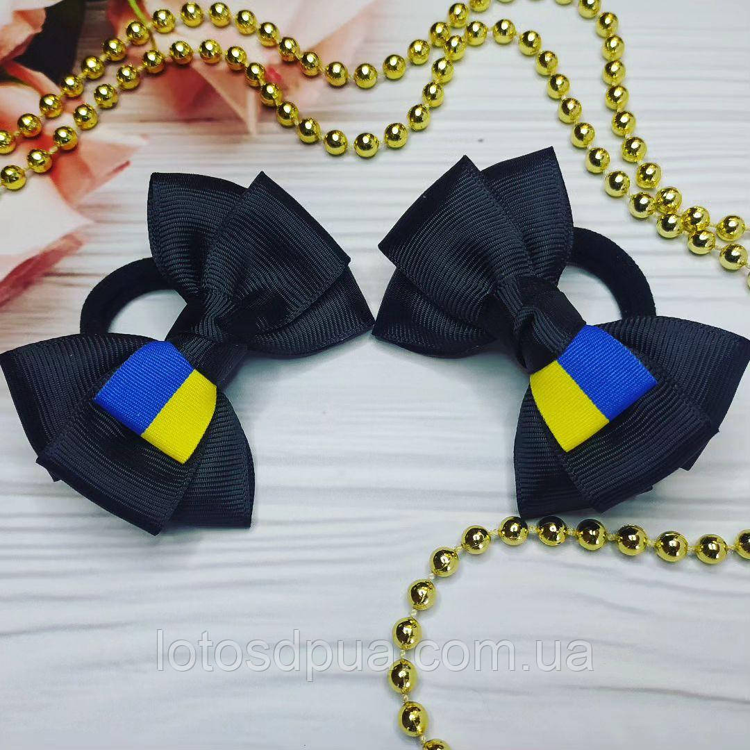Бант на резинці виконаний із репсової стрічки чорного кольору, прикрашений репсовою стрічкою жовто-синього кольору. Довжина - 8 см. Можна виконати на заколкі.